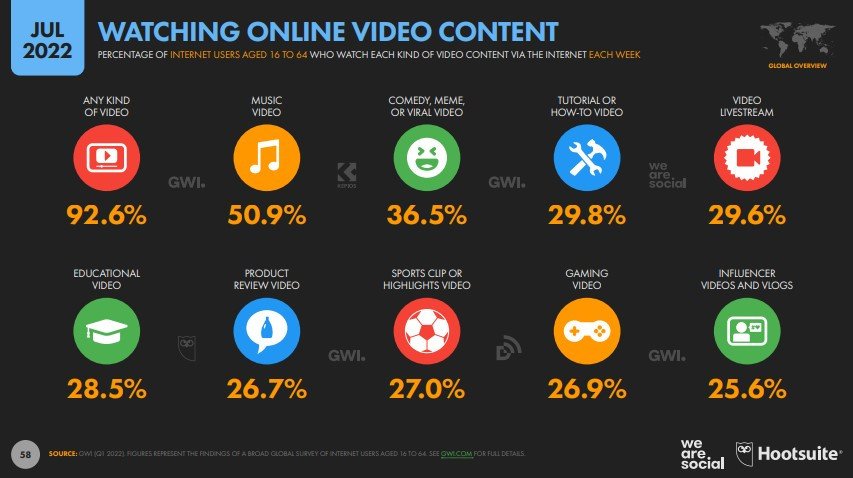 Un 92.6% de los y las internautas usan la red para ver videos, 50.9% son de música, 36.5% son stand-up cómicos, 29.8% ve tutoriales, 29.6% ve livestreaming. El 91% de las personas usa el internet en servicios de contenidos de películas vía streaming (Netflix, HBO Max, Amazon Prime, Paramount+, Apple Tv).
