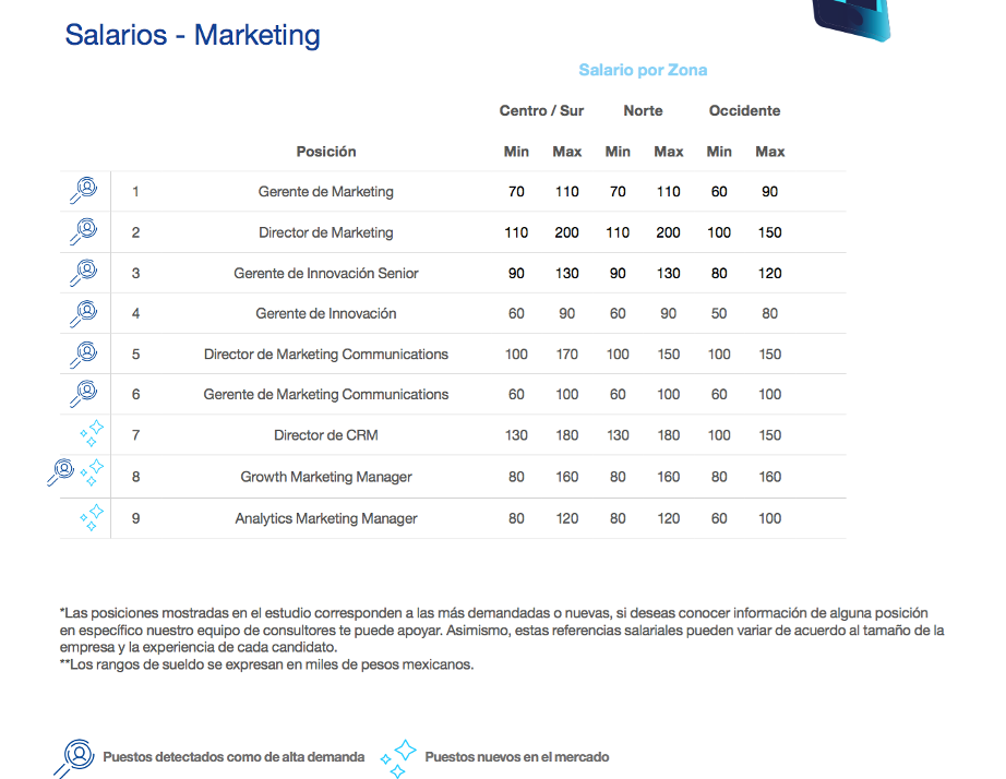 De acuerdo con la sección del estudio elaborada por Michael Page, que considera posiciones de gerencias senior a direcciones, la tres industrias principales con mayor demanda de especialistas de Marketing son la de fintech, e-commerce y FMCG (Fast Moving Consumer Goods).
