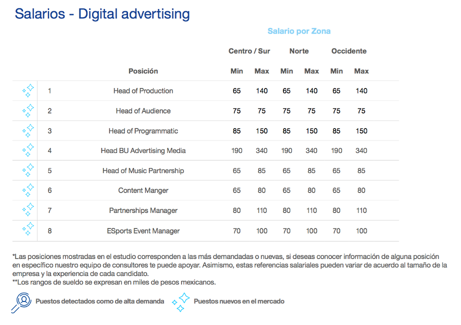 Los empleos relacionados con la digitalización de los negocios y el e-commerce lideraron los incrementos salariales en la mayoría de las industrias y en los diferentes niveles jerárquicos, alcanzando aumentos de hasta 30% en algunos casos. A continuación te comparto esas tablas para que te des una idea de los sueldos en cada una de las posiciones.